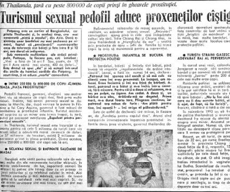 O anchetă publicată în „Bulina albastră” – ediția de prânz a Evenimentului zilei, din acei ani – din 19 iulie 1995, arată cum în exotica destinație, anual, aproximativ 800.000 de copii alimentau „cererea” de pe piața prostituției infantile. În articol se mai arăta cum prostituția copiilor se bucura de protecția poliției thailandeze și cum au ajuns pedofilii cu experiență și bani să pretindă, pentru scârbavnicele lor nevoi, copii de vârste cât mai fragede, de frica virusului HIV.