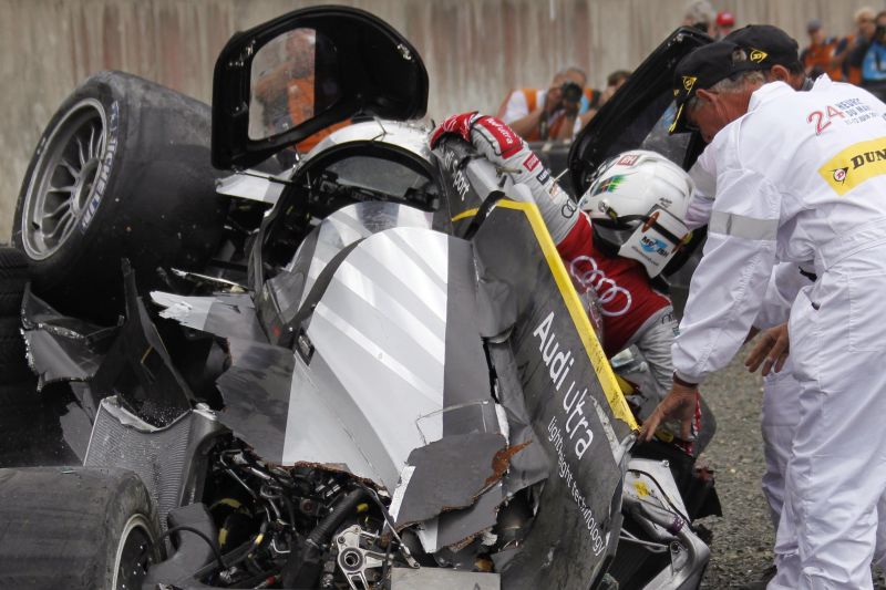 Monopostul Audi R18, pilotat de britanicul McNish (care a concurat ani buni şi în Formula 1), s-a ciocnit de Ferrariul lui Anthony Beltoise şi s-a izbit apoi puternic de parapetul circuitului. Din fericire, McNish a scăpat cu viaţă din teribila coliziune. Pilotul britanic a fost transportat la spital, însă a revenit apoi pe circuit.