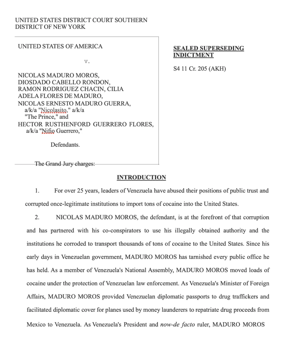 «În calitate de președinte și acum conducător de facto al Venezuelei, MADURO MOROS permite corupției alimentate de cocaină să înflorească pentru propriul beneficiu, pentru beneficiul membrilor regimului său și pentru beneficiul membrilor familiei sale. Inculpatul se află acum în fruntea unui guvern corupt și ilegitim care, timp de decenii, a folosit puterea guvernamentală pentru a proteja și promova activități ilegale, inclusiv traficul de droguri.