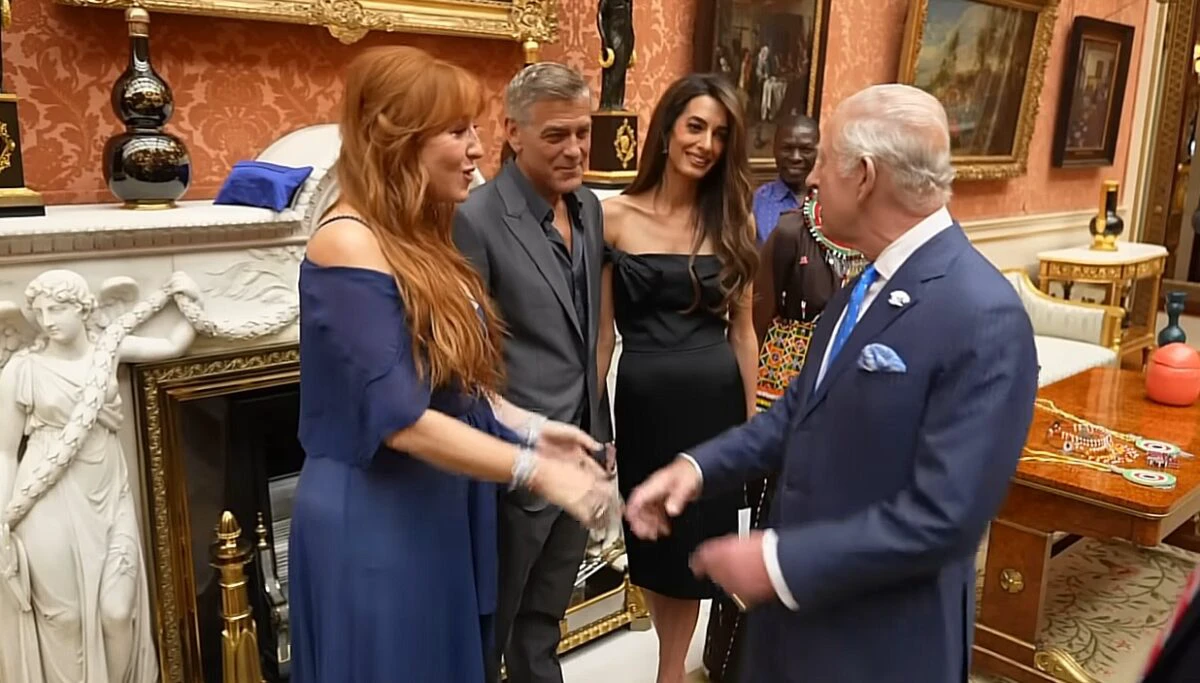 Conform filmării, Regele Charles răspunde cu un zâmbet, îi strânge mâna și continuă discuția cuplului Clooney, arătând spre un punct din încăpere.