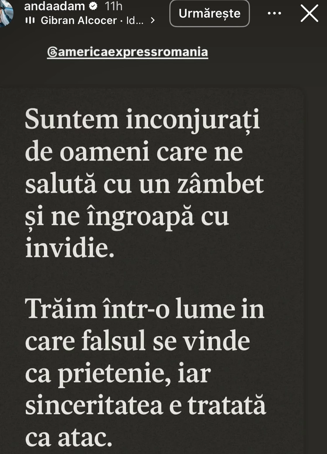 Artista este cunoscută pentru replicile ei, dar acum s-a dezlănțuit. ”Suntem înconjurați de oameni care ne salută cu un zâmbet și ne îngroapă cu invidie. Trăim într-o lume în care falsul se vinde ca prietenie, iar sinceritatea e tratată ca atac”. Aceasta a fost postarea Andei, în care tăguit emisiunea Asia Express.
