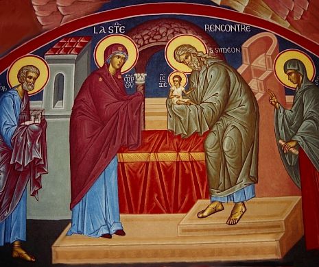 Evident că Maria nu avea nevoie de purificare după naşterea minunată a Fiului lui Dumnezeu, dar ea se supune cu smerenie vechii legi, aşa cum şi Mântuitorul o va face. Prin urmare, Pruncul este dus de Fecioara Maria şi de Iosif, la Templu, dimpreună cu o pereche de turturele care trebuiau jertfite lui Dumnezeu. Aici sunt întâmpinaţi de bătrânul preot Simeon şi de proorociţa Ana.