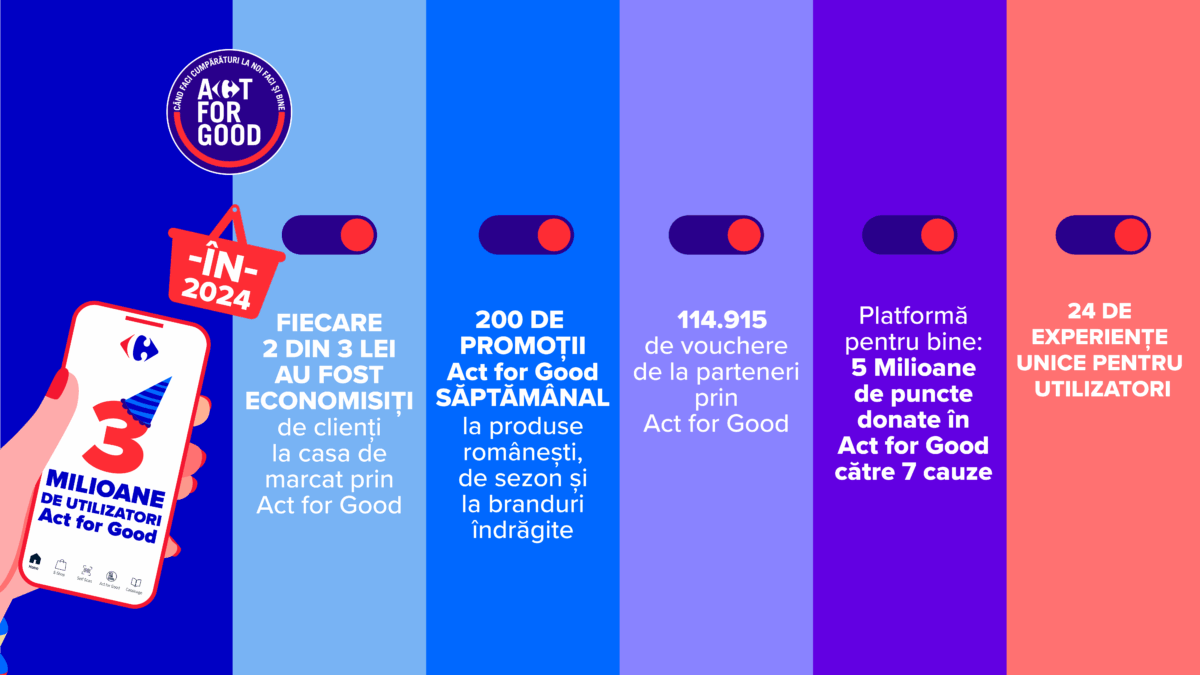 Carrefour România prezintă profilul de consum al clienților săi din platforma de loialitate Act for Good. Integrată în aplicația mobilă Carrefour, comunitatea Act for Good reunește în prezent peste 3 milioane de utilizatori la 4 ani de la lansarea programului. De la legume și fructe locale, până la produse bio și vinuri românești, datele generate pe parcursul întregului an 2024 din analiza profilului de consum al utilizatorilor, arată o orientare clară către produse sănătoase, sustenabile și accesibile, într-un ecosistem digital ce permite personalizarea ofertelor, susținerea producătorilor locali și beneficii atractive pentru clienți.