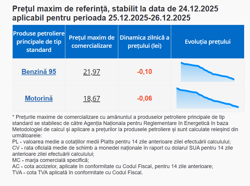 Pentru zilele de 25 și 26 decembrie 2025, Agenția Națională pentru Reglementare în Energetică (ANRE) a stabilit următoarele prețuri maxime de comercializare cu amănuntul pentru produsele petroliere standard. Astfel, un litru de benzină cu cifra octanică 95 se va comercializa cu 21,97 lei/litru, o scădere de 10 bani. Motorina se va vinde cu cel mult, 18,67 lei/litru, o reducere de 6 bani.
