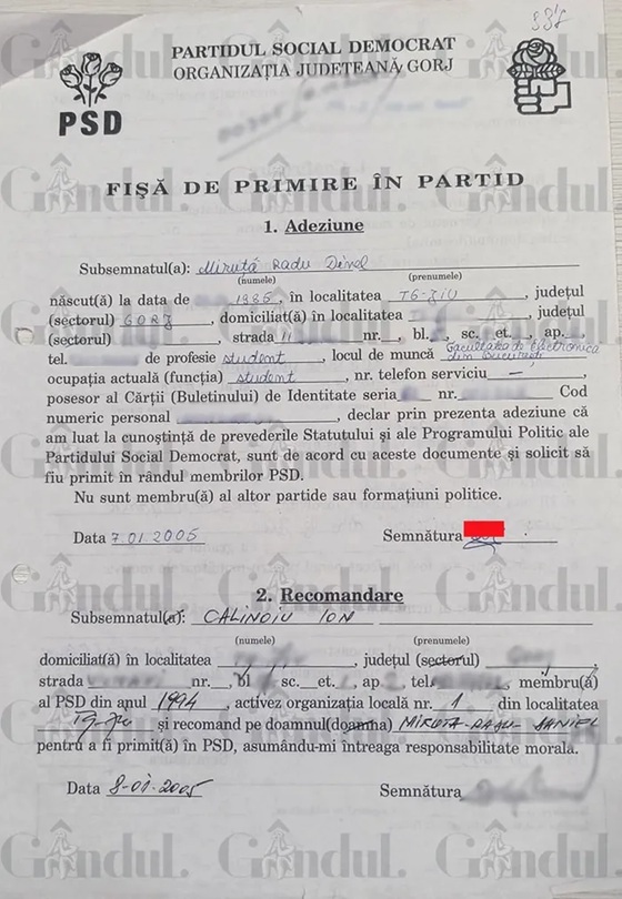 Documentul oficial, denumit „Fișa de Primire în Partid”, confirmă că Miruță și-a oficializat adeziunea chiar la începutul anului 2005.