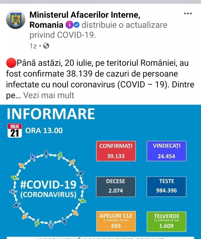 Reprezentanții Ministerului Afacerilor Interne au publicat, luni, pe pagina de Facebook a instituției, un grafic cu date statistice privind evoluția pandemiei de coronavirus. Autorul postării a trecut o dată greșită pe imaginea cu informațiile statistice, 21 iulie. Astfel, la prima vedere, părea că luni, 20 iulie, ministerul a dat publicității informații care ar fi trebuit să apară abia marți, o zi mai târziu.