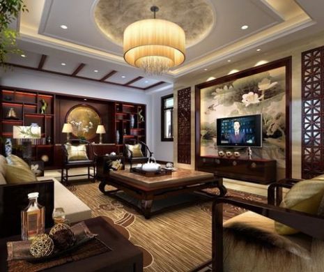 În cultura chineză, decorarea casei se face într-un mod cât mai simplu, iar fiecare obiect face parte dintr-o poveste spirituală. Nu doar sculpturile cu dragoni sau picturile cu pești Koi dau viață stilului lor, ci relația obiectelor din locuință cu natura. În livingurile asiatice se vor regăsi broderii cu modele florale, în special cele cu flori de cireș, mătase în culori vii precum roșu și auriu, iar baza fundamentală este negrul. De asemenea, un alt element definitoriu este și prezența multor pereți transparenți – din lemn sculptat în general – și a „pereților mobili”, fixați pe scripeți asemănător ușilor.