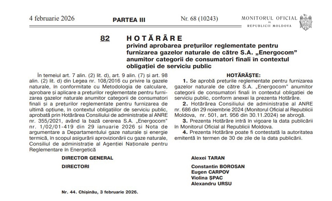 Republica Moldova. Decizia Agenției Naționale pentru Reglementare în Energetică (ANRE) privind micșorarea tarifelor la gazele naturale a fost publicată în Monitorul Oficial. Astfel, consumatorii casnici din Republica Moldova vor plăti mai puțin pentru gazele naturale.