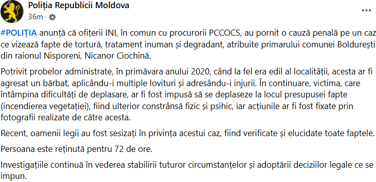 Republica Moldova. Fostul primar de Boldurești, raionul Nisporeni, Nicanor Ciochină, acuzat că ar fi lovit mortal un copil, a fost reținut joi-seară, 29 ianuarie, de ofițerii Batalionului „Fulger”, în cadrul unui dosar de tortură instrumentat de Procuratura pentru Combaterea Criminalității Organizate și Cauze Speciale (PCCOCS).