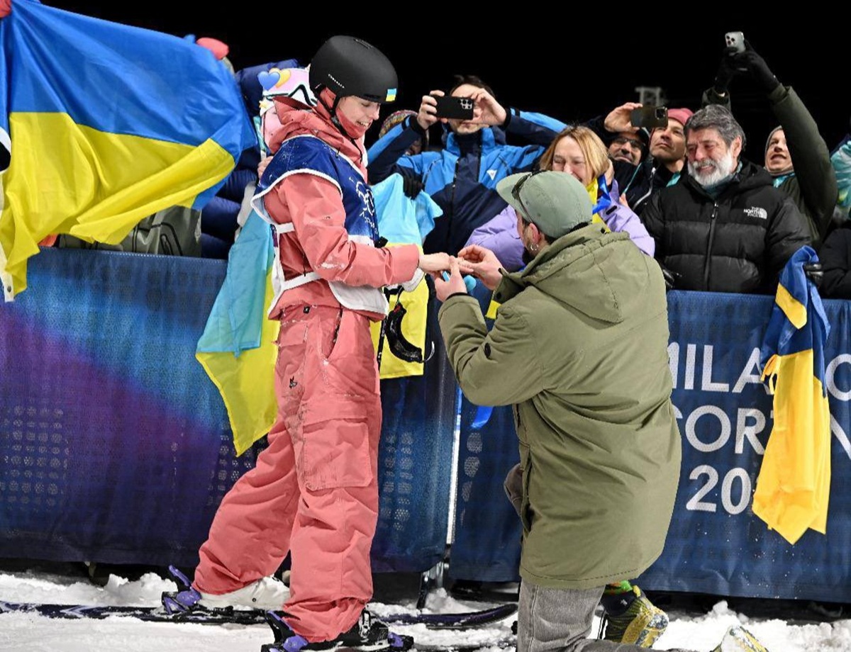 Sportiva, care încă purta casca și mănușile, a fost așteptată la baza pârtiei de partenerul ei, care a cerut-o în căsătorie de Ziua Îndrăgostiților. Schioarea acrobatică, în vârstă de 25 de ani, a spus „da”, apoi și-a sărutat logodnicul, purtând inelul pe degetul drept, potrivit tradiției din Ucraina și din mai multe țări din Europa de Est.