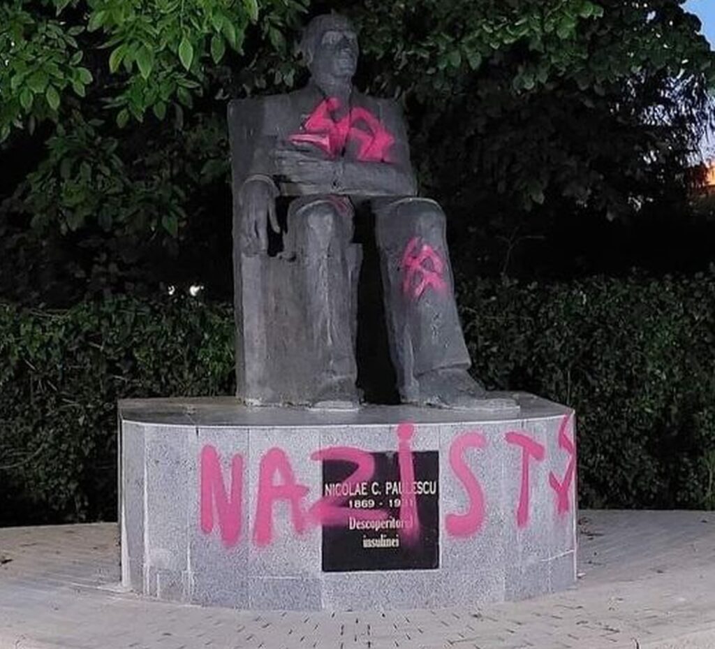 O statuie din București a savantului român a fost vandalizată. Nicolae Constantin Paulescu (1869 – 1931) a fost un om de știință român, de profesie medic și fiziolog la Facultatea de Medicină din București, acesta fiind și cel care a descoperit hormonul antidiabetic eliberat de pancreas, insulina. De altfel, Paulescu a fost catalogat drept un adept al ideologiei de extremă dreapta, asta din pricina scrierilor sale, cum este de exemplu „Spitalul, coranul, talmudul, cahalul si francmasoneria”.