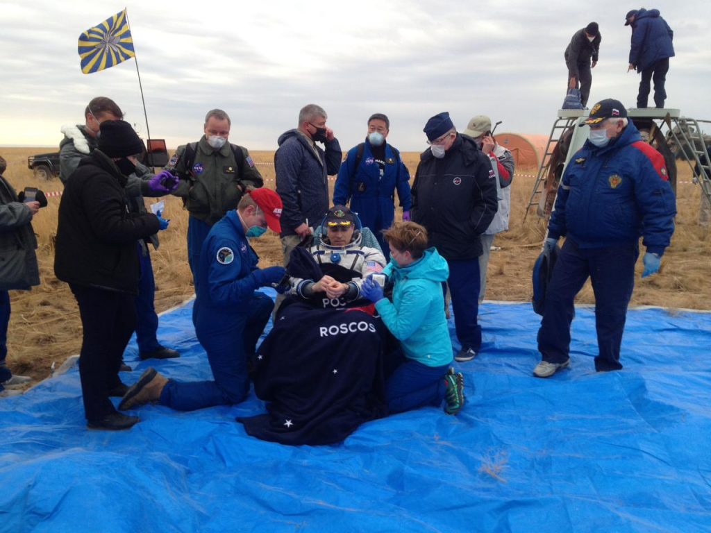 În imagini Chris Cassidy îl salută cu cotul pe membru al personalului venit la locul de aterizare, înainte ca cei trei astronauți să fie duși într-un cort pentru examinări medicale. „Ce mai faceți ?”, a întrebat în limba rusă Cassidy în rusă, zâmbind.