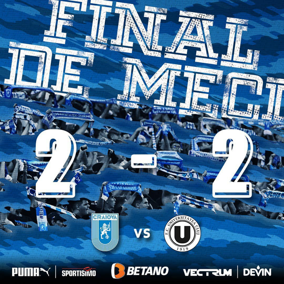 Universitatea Craiova - U Cluj, 2-2. sursa: FacebookUniversitatea Craiova s-a mulțumit doar cu 1 punct, la finalul partidei disputate, vineri, pe teren propriu, împotriva celor de la Universitatea Cluj, scor 2-2.