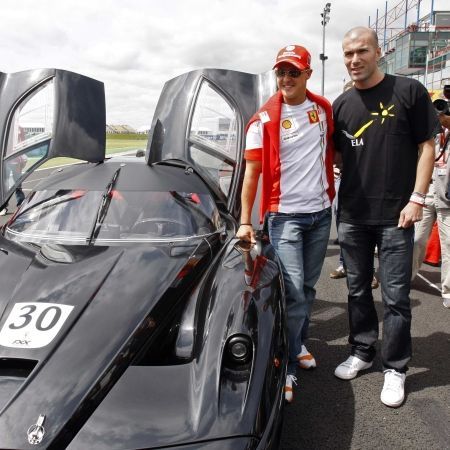 Fostul fotbalist francez Zinedine Zidane si septuplul campion mondial de Formula 1 Michael Schumacher au gonit ieri pe circuitul de la Magny-Cours, intr-un automobil Ferrari FXX.